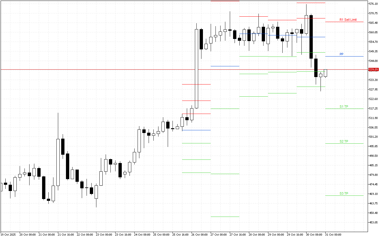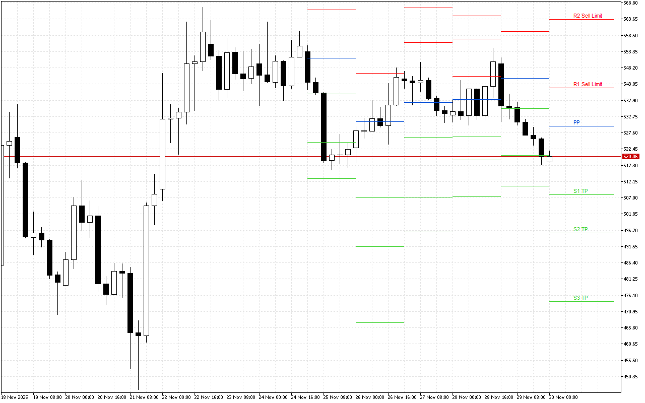 PP: 529.68;S1: 507.92; S2: 495.84; S3: 474.08;R1: 541.76; R2: 563.52; R3: 575.60.