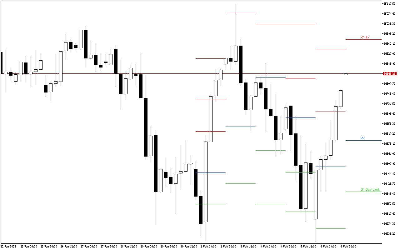 Niveauet for Pivot Points er 24987.89. Grafen viser markedsåbningen under dette niveau, hvilket indikerer overvægten af negativ stemning. Derfor er det tilrådeligt at kigge efter muligheder for at åbne korte positioner i løbet af dagen.