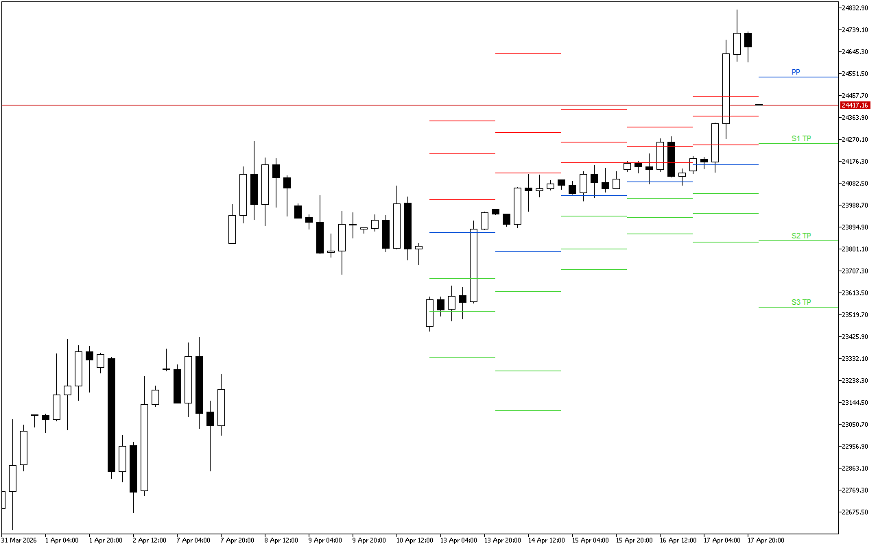 Niveauet for Pivot Points er 24537.44. Grafen viser markedsåbningen under dette niveau, hvilket indikerer overvægten af negativ stemning. Derfor er det tilrådeligt at kigge efter muligheder for at åbne korte positioner i løbet af dagen.