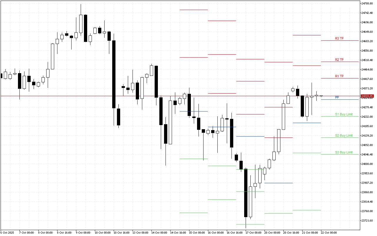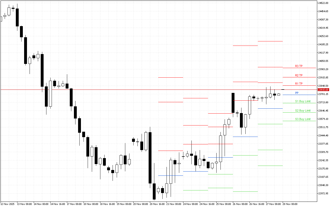 Ներկայիս Pivot Points մակարդակը 23774.48 է: PP-ի մակարդակից բարձր շուկայի բացումը վկայում է լավատեսական տրամադրությունների գերակշռության մասին, ուստի ներօրվա ընթացքում արժե փնտրել երկար դիրքեր մուտքի կետեր:
