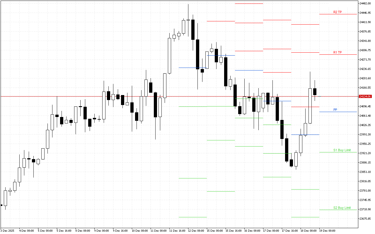 PP: 24551.46;S1: 24455.87; S2: 24277.96; S3: 24182.37;R1: 24729.37; R2: 24824.96; R3: 25002.87.