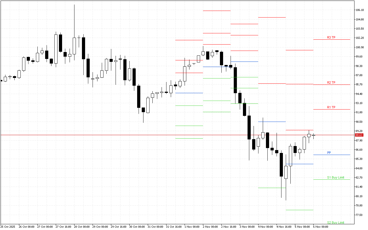 Das Niveau von Pivot Points liegt bei 85.09. Nach dem Diagramm liegt die Markteröffnung darunter, was auf eine vorherrschende negative Stimmung hinweist. Daher ist es ratsam, untertägig nach Möglichkeiten zum Eröffnen von Short-Positionen zu suchen.