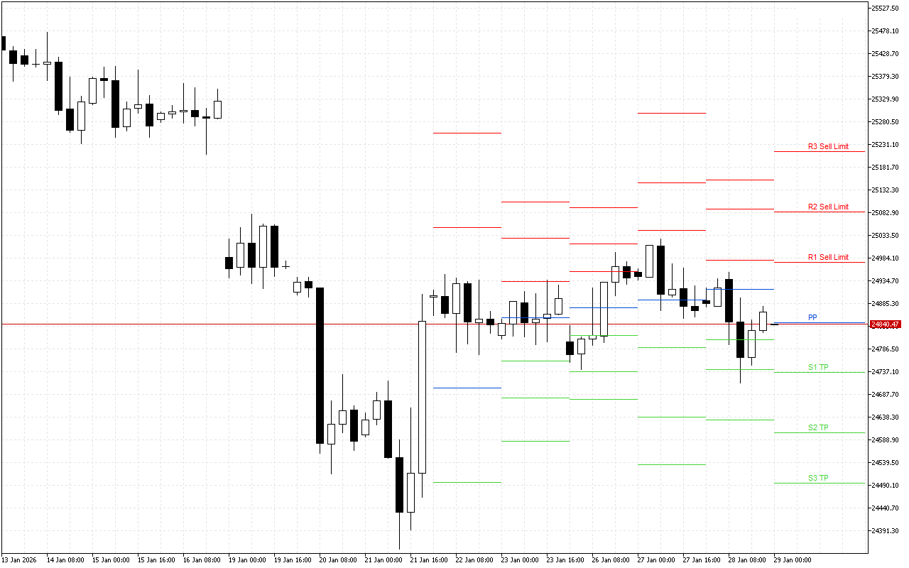 Das Diagramm hat den Wert Pivot Points im Bereich 0.77327 generiert. Die vorhandene Markteröffnung darunter bedeutet, dass eine pessimistische Stimmung vorherrscht. In diesem Fall sollte der Trader eher nach Einstiegspunkten für Short-Positionen suchen.