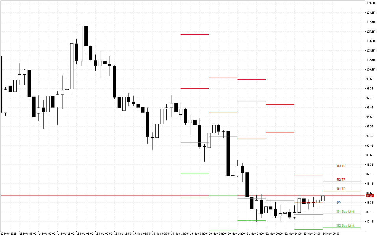 The Pivot Points level is 85.09. The chart shows the market opening below this level, which indicates the predominance of negative sentiment. Therefore, it is advisable to look for opportunities to open short positions throughout the day.
