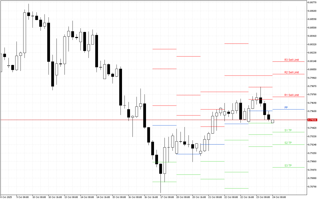 The support levels, marked green on the chart, are at the S1 0.80141, S2 0.79978, and S3 0.79695 levels.
