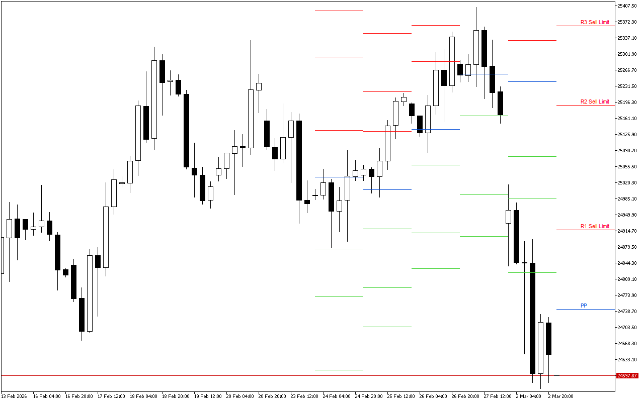 El gráfico generó el valor Pivot Points en el área 0.77625. Ya que el mercado abrió por debajo de él, indica un estado de ánimo pesimista predominante. En este caso, el operador debería tender a buscar puntos de entrada a posiciones cortas intradía.