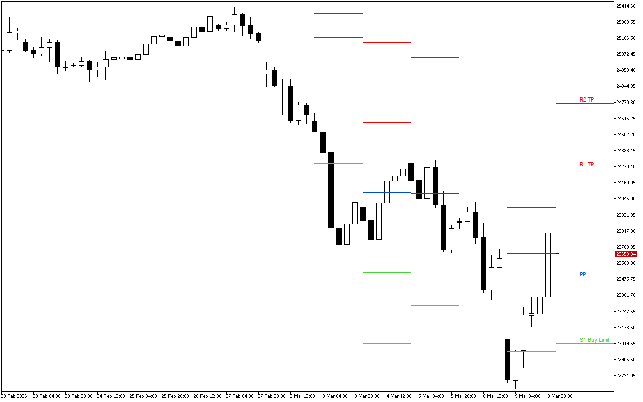 Det anbefales å se etter potensielle markedsinngangspunkter i området PP og nivåene S1, S2, S3, nevnt ovenfor. Fortjenesten er fast når prisen når nivåene R1, R2 og R3.