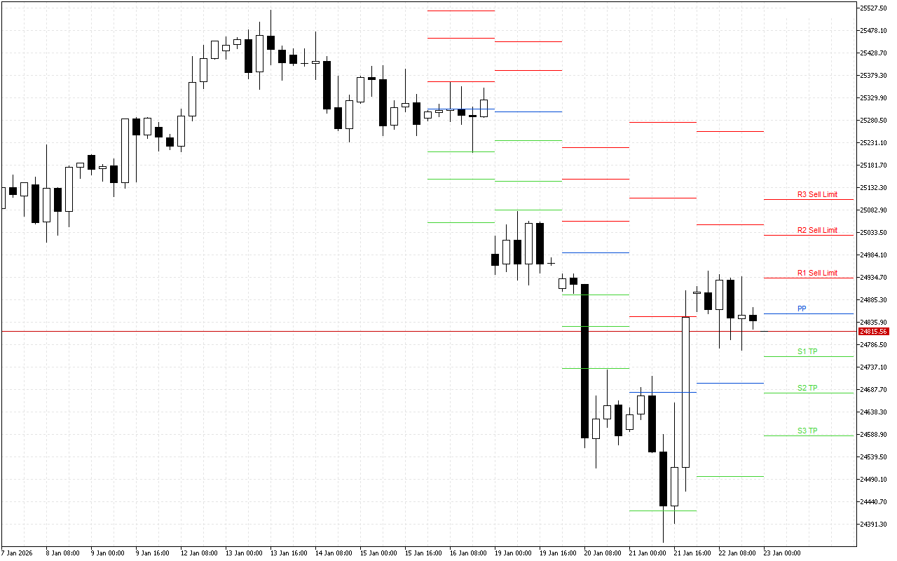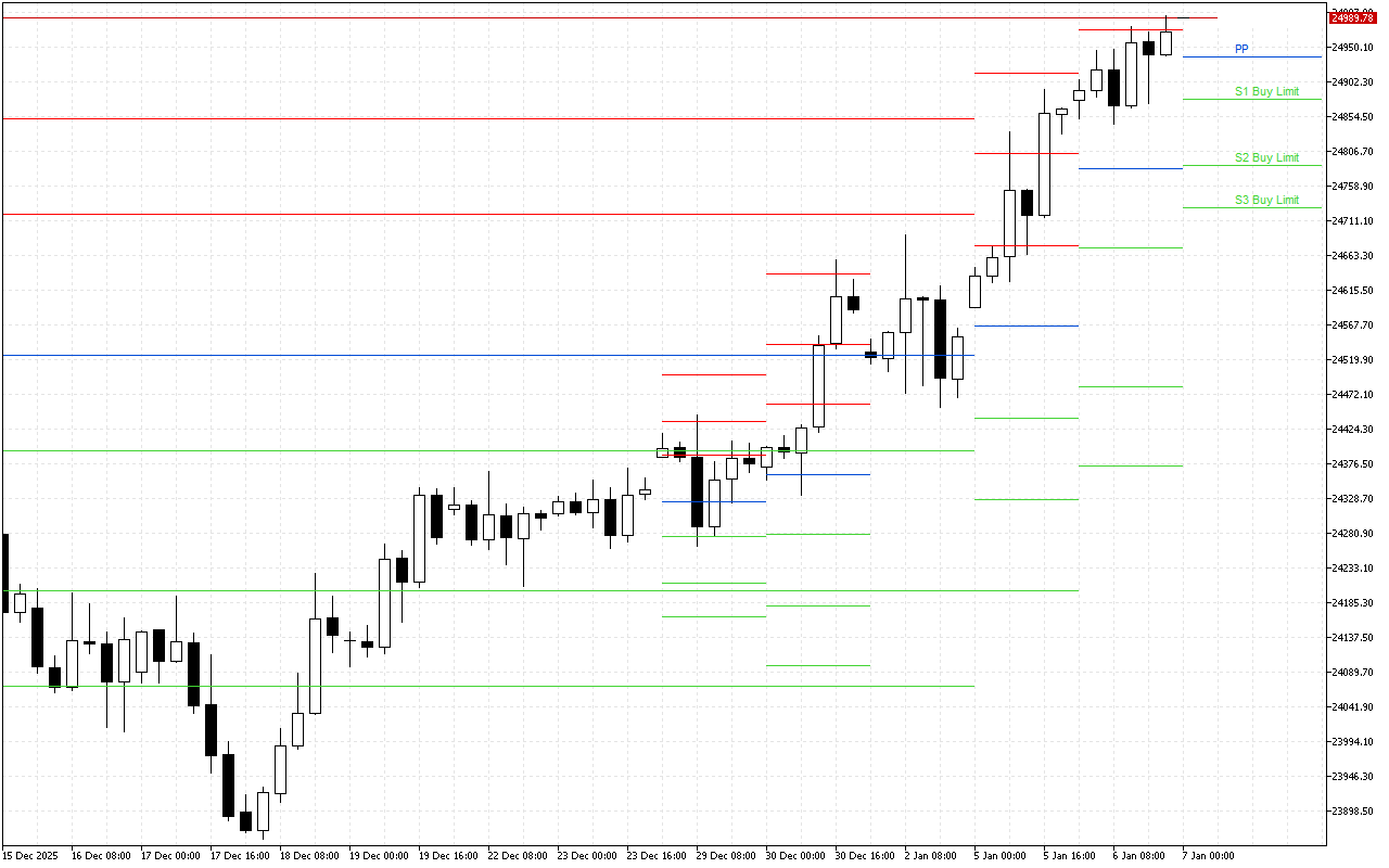 O mercado pode ser acessado tanto pelo nível PP quanto quando o preço retorna para R1, R2, R3. O lucro é fixado quando o preço atinge os níveis S1, S2, S3.