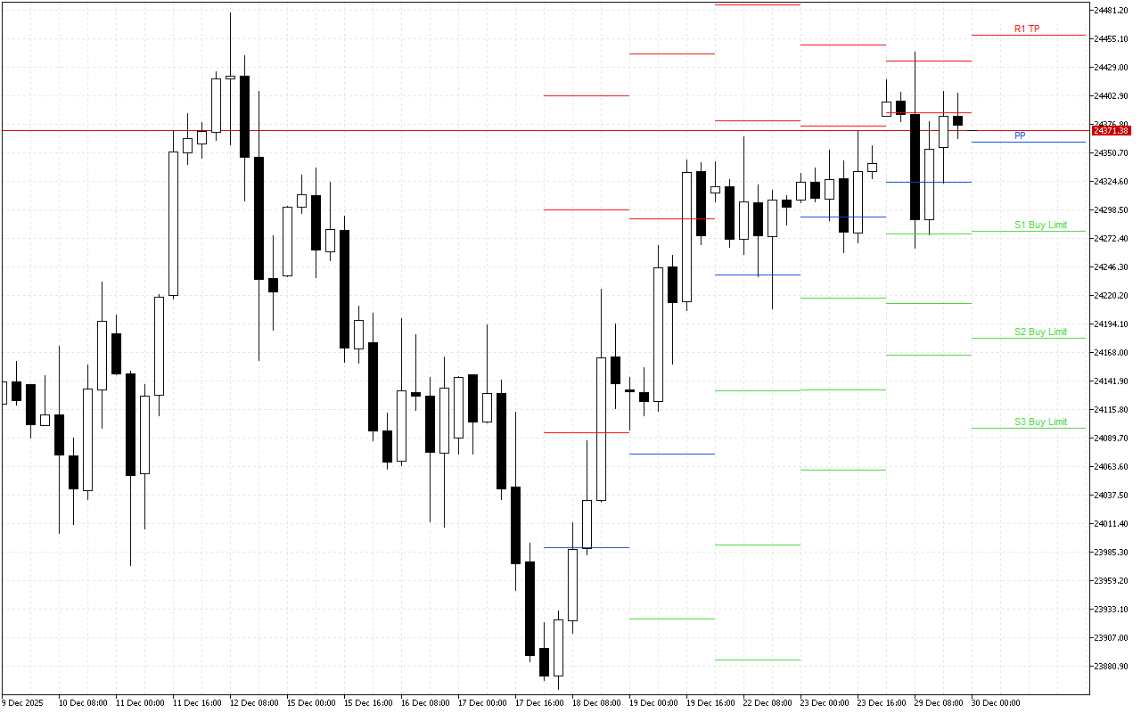 Уровень Pivot Points составляет 0.79499. График показывает открытие рынка ниже этой отметки, что свидетельствует о преобладании негативного сантимента. Следовательно, в течение дня рекомендуется искать возможности для открытия коротких позиций.