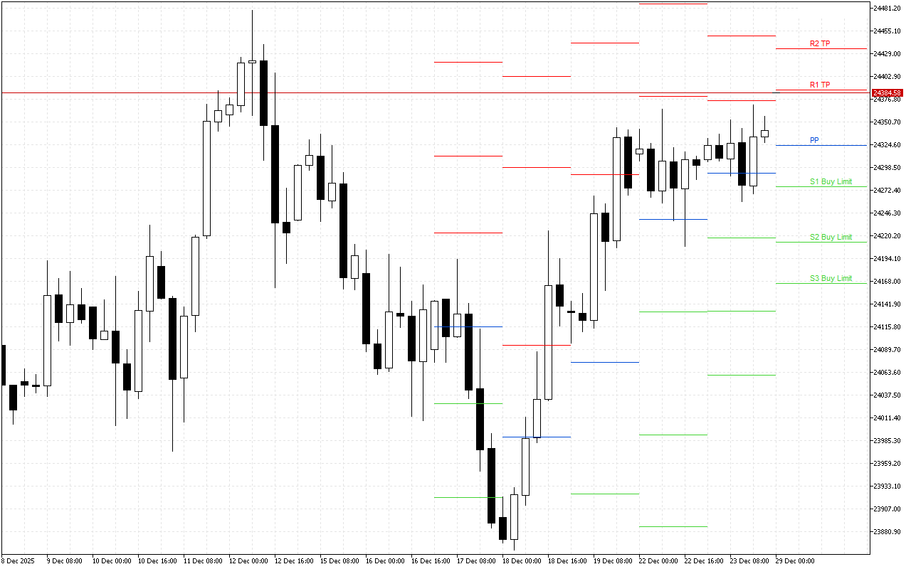 PP: 25240.68;S1: 25077.52; S2: 24986.43; S3: 24823.27;R1: 25331.77; R2: 25494.93; R3: 25586.02.