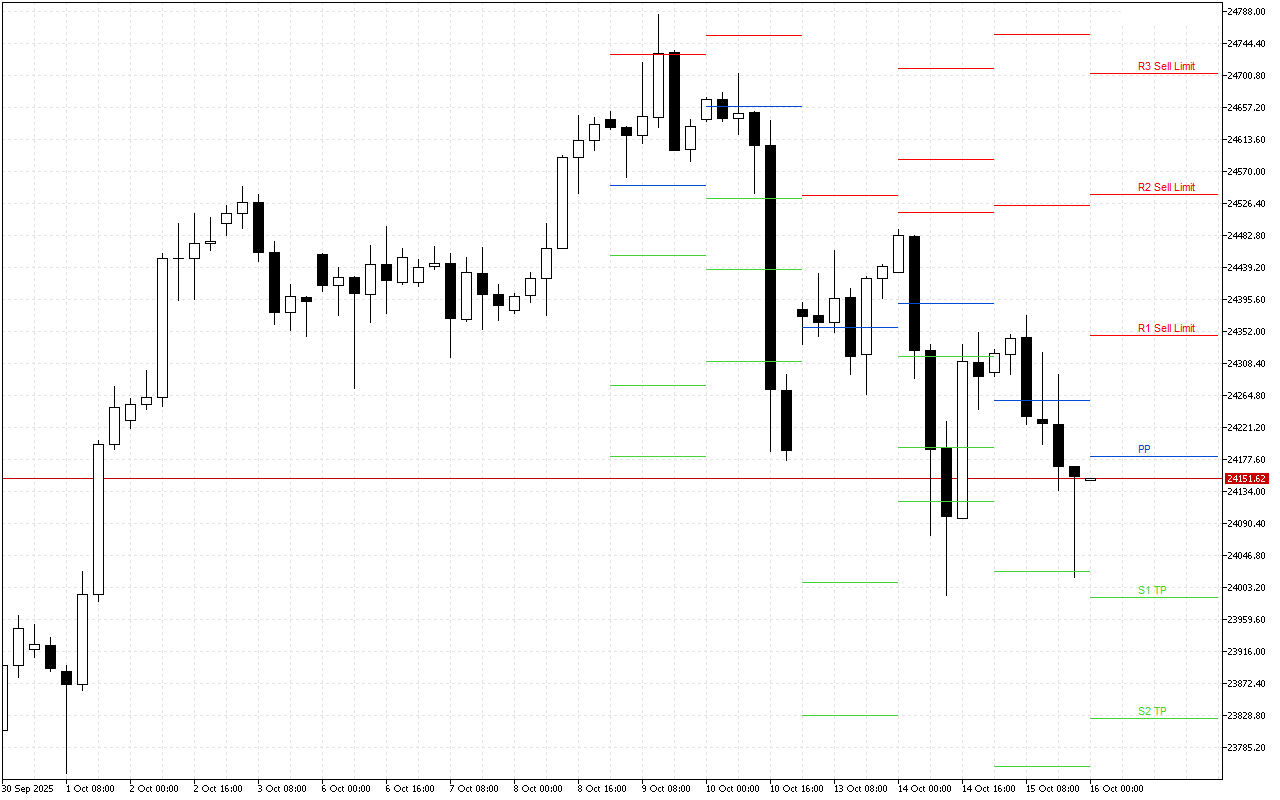 Marknaden kan gå in både från PP-nivån och när ett pris rullar tillbaka till R1, R2, R3. Vinsten är fast när priset når nivåerna S1, S2, S3.