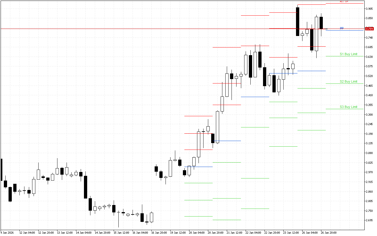 Nivån Pivot Points är 0.79499. Diagrammet visar marknadsöppningen under denna nivå, vilket indikerar dominansen av negativt sentiment. Därför är det lämpligt att leta efter möjligheter att öppna korta positioner under hela dagen.
