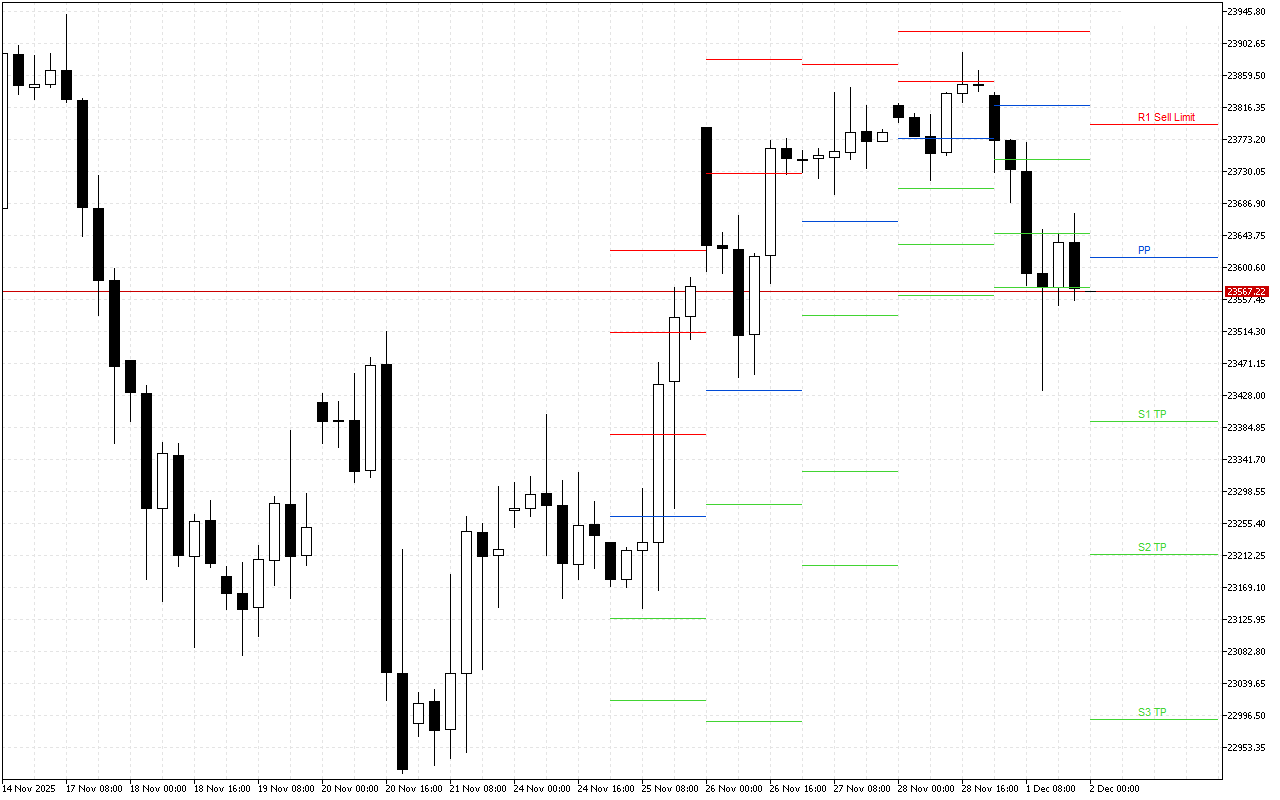 ควรพิจารณาจุดเข้าที่ระดับ PP และเมื่อราคาลดลงมาที่บริเวณระดับแนวต้านที่ทำเครื่องหมายด้วยสีแดง การซื้อขายจะปิดเมื่อราคาถึงระดับ S1, S2, S3