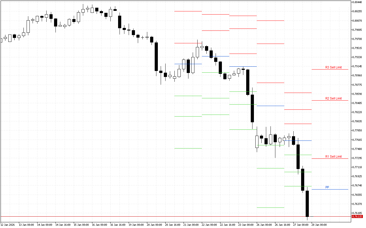 Pivot Points արժեքը ներկայումս 0.77333 է: Շուկան բացվել է այս մակարդակից ցածր, ինչը հուշում է հոռետեսական տրամադրությունների առկայության մասին։ Նման իրավիճակում ներօրային առաջնահերթությունը տրվում է կարճ դիրքերում մուտքի կետերի որոնմանը: